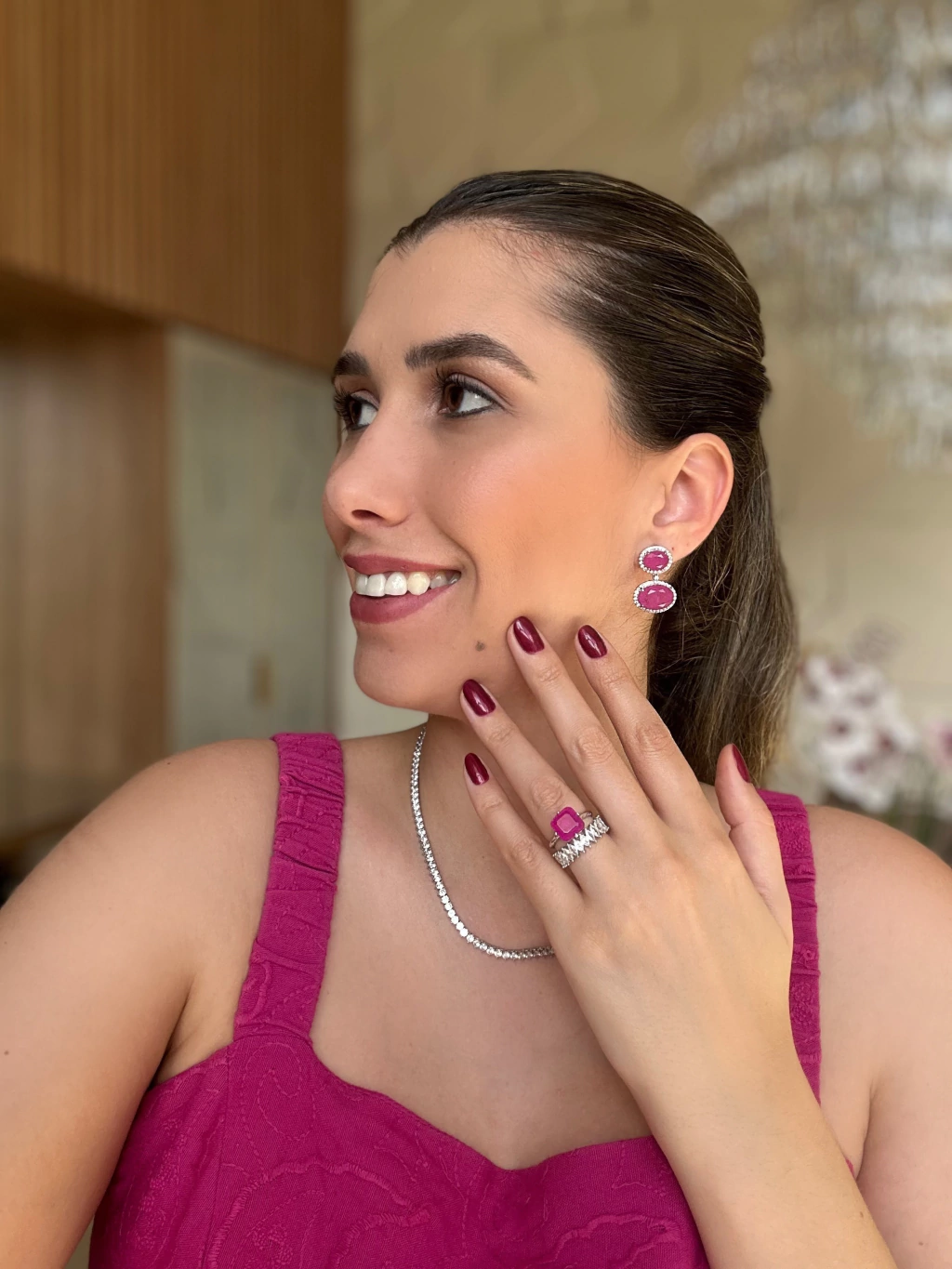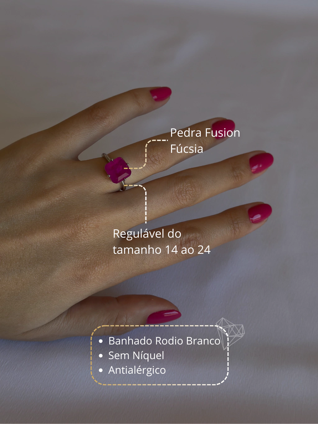 Anel Regulável Fusion Fúcsia Banhado no Rodio Branco