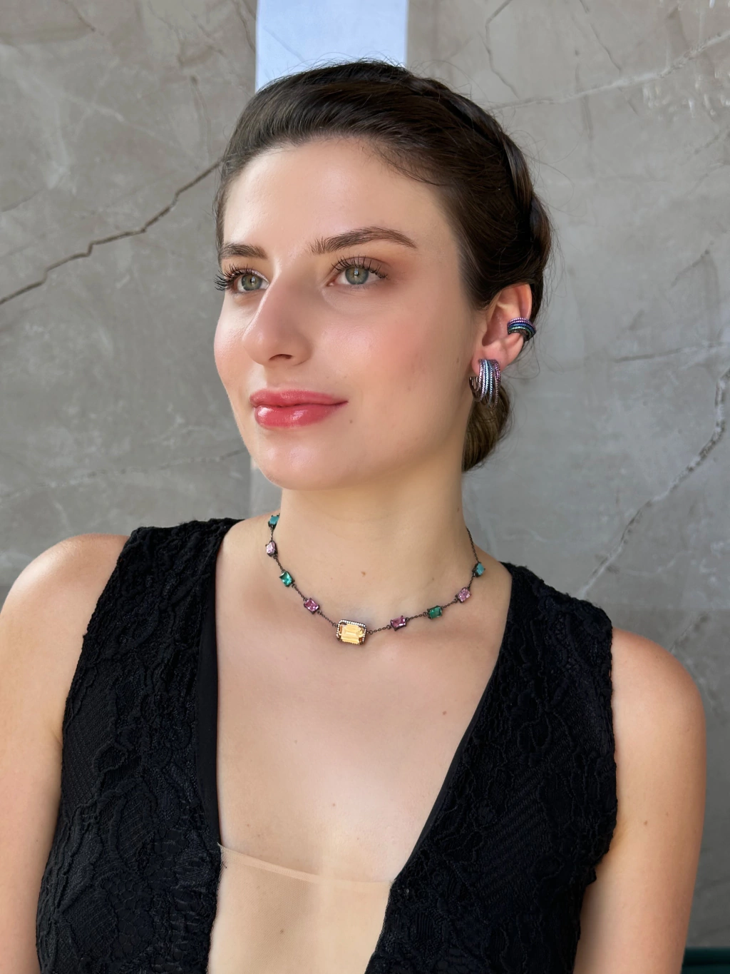 Brinco de Argola Feminino Cravejado com Cristais Colors no Rodio Negro